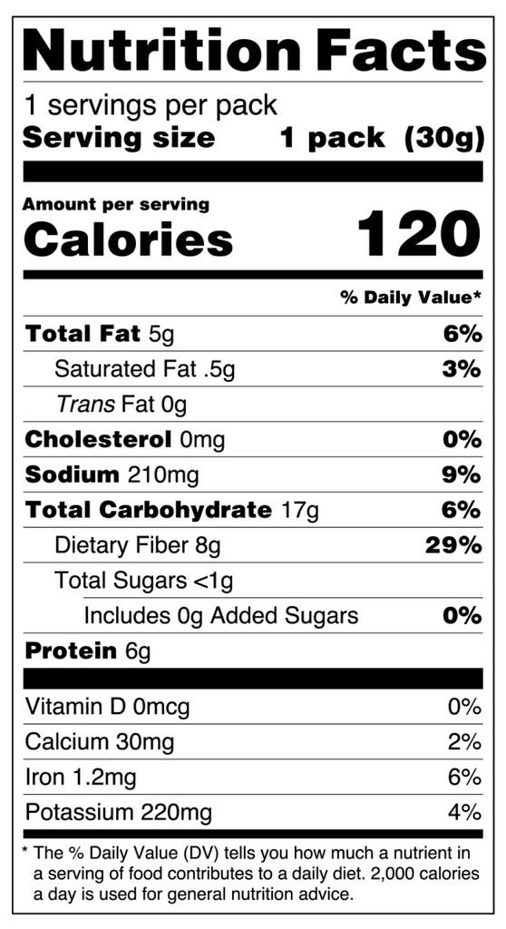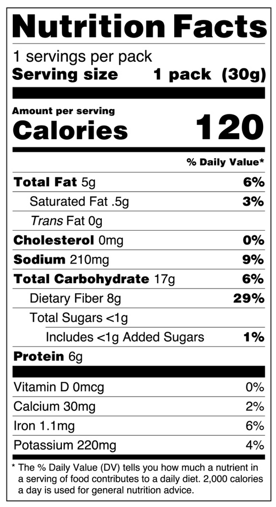 INGREDIENTS: Fava bean flour, green pea flour, high oleic sunflower oil, red lentil flour, chicory root fiber, fava protein, pea fiber, barley fiber, citrus fiber, sugar, sea salt, gum arabic, citric acid, vinegar solids, onion powder, apple cider vinegar solids, natural flavor, acetic acid, Probiotic (Bacillus Coagulans GBI-30 6086) Made on a line that also processes: Milk (Dairy), Egg, Soy, Wheat (Gluten)